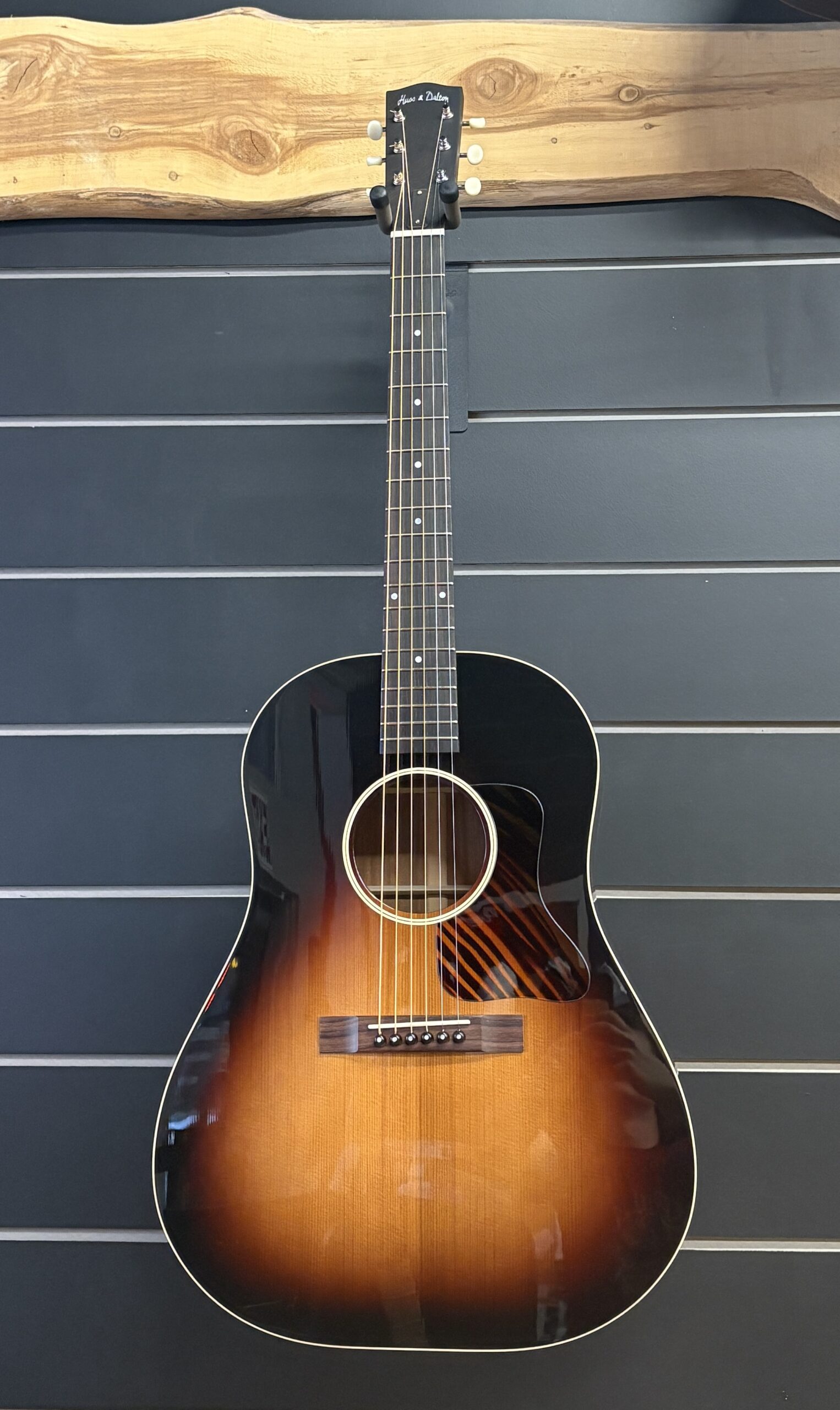 From Huss & Dalton- “Take the H&D standard DS. Convert it to a flat top with a short scale. Then take a chisel to the bracing to compensate for the shorter scale length. Strip it back to an unostentatious dress code but maintain the dark sunburst, and you have a workingman’s guitar of epic proportions. This guitar can pick a gentle child’s tune or rage across a stage.”